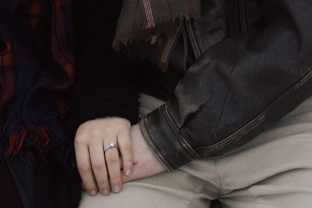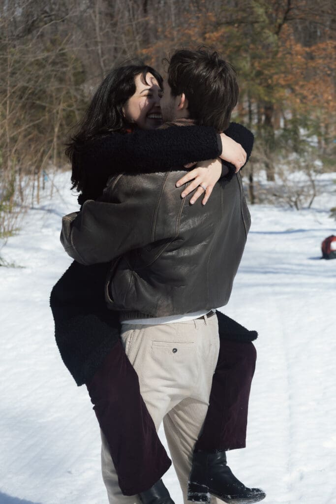 The couple traveled from Ottawa to Montreal for their engagement photos, choosing one of the city’s most iconic winter locations: Lac aux Castors, located in the heart of Mount Royal Park. Known for its picturesque skating rink and stunning views of the mountain, it’s one of the best places in Montreal for a romantic winter engagement session.