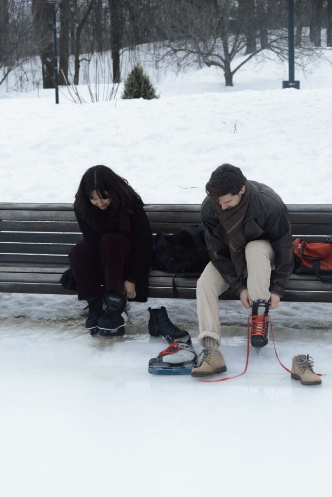 As they laced up their skates at Lac aux Castors, you could immediately feel their excitement. Skating together brought such a natural and playful energy to the session. Between gentle glides across the ice, warm hugs, and bursts of laughter, every moment felt authentic and effortless.