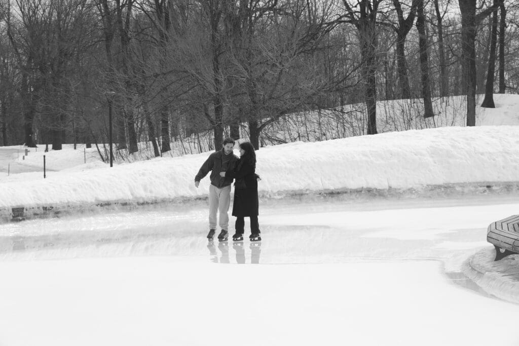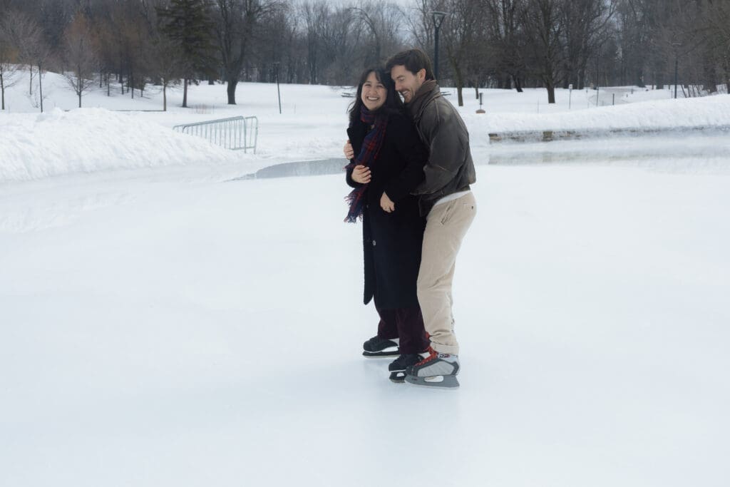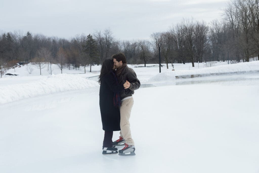 For couples looking for a winter engagement session in Montreal, Lac aux Castors is truly one of the best locations. In the colder months, the skating rink becomes a lively yet romantic setting surrounded by snow-covered trees and mountain scenery.